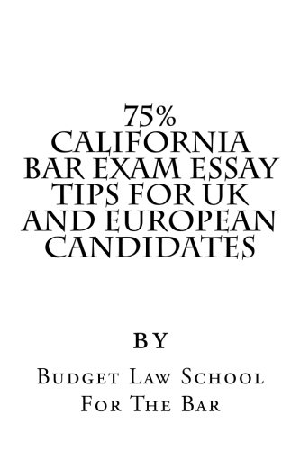 Value Bar Prep books are intended for direct Exam preparation. This is not a theory outline. 75% California Bar Exam Essay Tips For UK and European Candidates By Budget Law School For The Bar A paperback exam prep book for law students On the California bar exam you get a hypo (a detailed story showing events that have raised legal questions between parties). The interrogatory then boils down to: Whose legal and factual rights have been violated and by whom? What remedies exist for whom? What defenses?' The exam taker then enlightens the grader with a solutionary analysis of the legal issues raised, using the IRAC essay method explained in this book. 70% is the pass mark for the California bar rather than 50%, and 75% is considered a "clear pass". This best-selling powerful volume from Budget Law School For The Bar shows students how to apply the AAS method to take your IRAC to the 75% level and beyond.